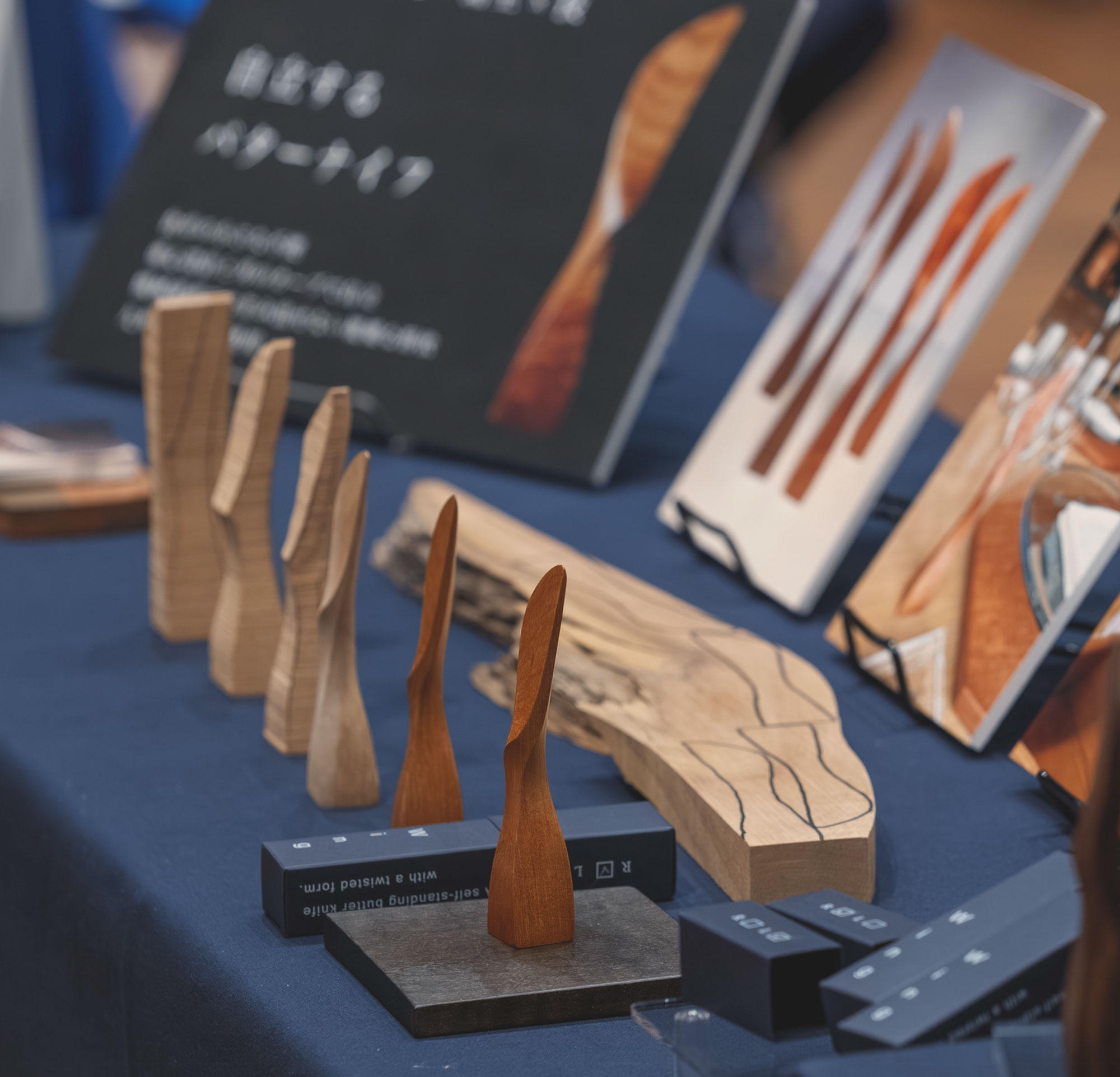 素材は右利き用が九州産の桜、左利き用はウォールナットを使用し、飲食店で使われる際でも大量にあるバターナイフの中から視覚的にすぐに選ぶことができます。